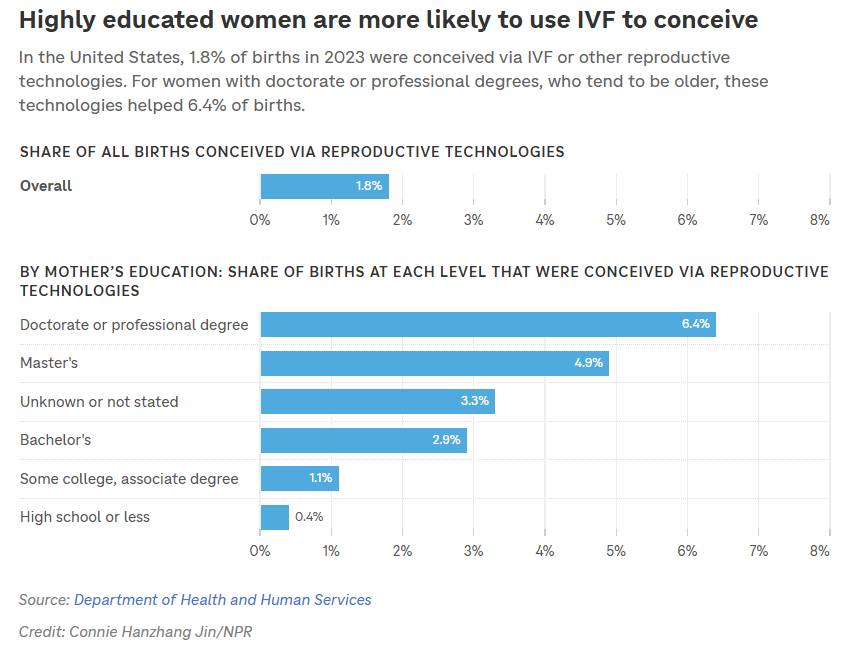 Women with higher education are the top users of IVF, enabling 6.4% of births among women with doctorate or professional degrees (as opposed to only 1.8% of births among the general population).