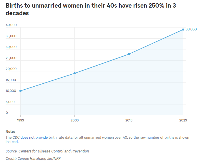 Births to unmarried American women in their 40s has quadrupled since 1993, largely through IVF. Highly educated women are the most likely to use. IVF births have increased 50% over the past decade.